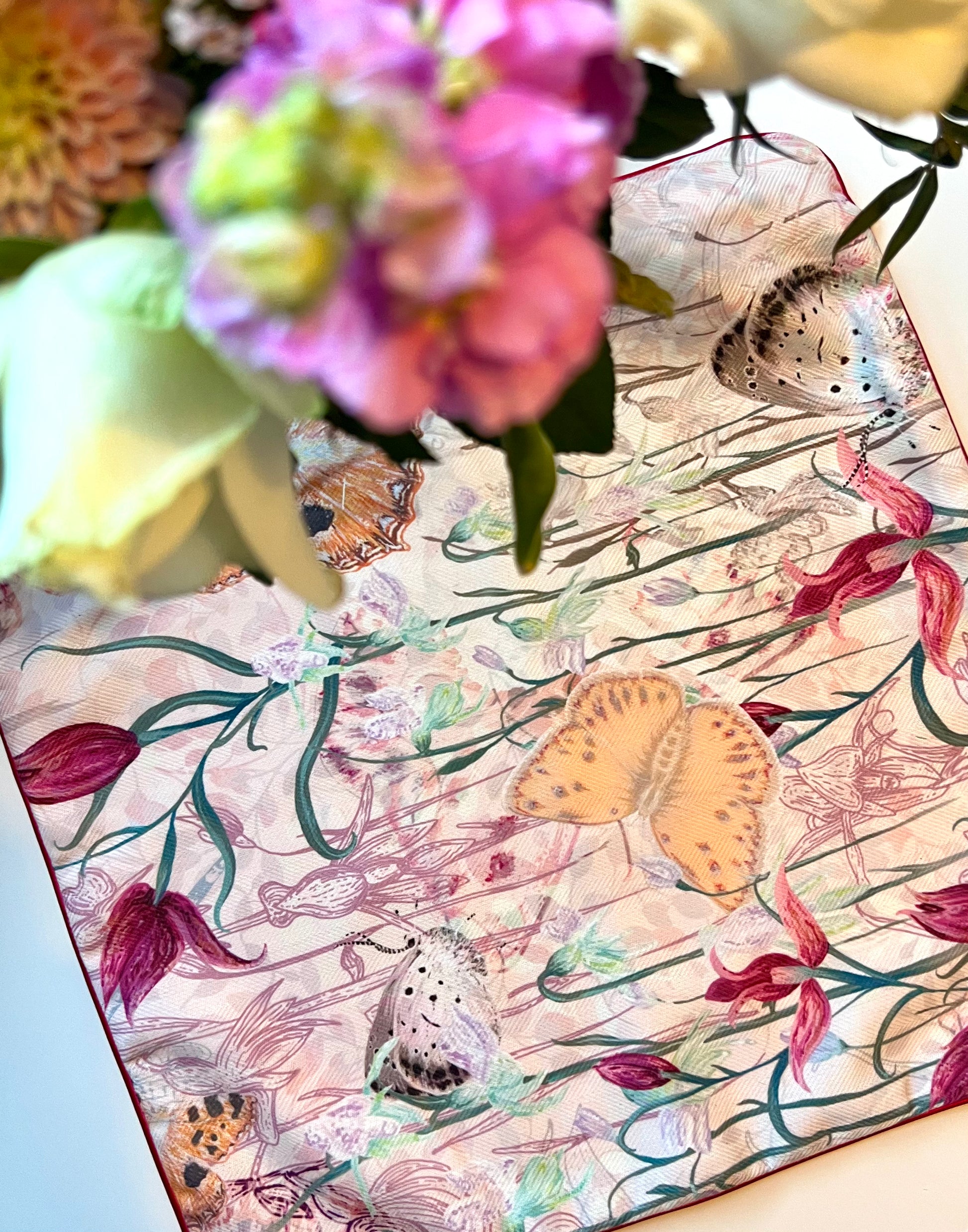 Currently available in multiple fabric options, this cushion is sustainably printed and hand-made in the UK, and features two differing sides to give you the ultimate versatility on those days you wish to quieten your space; The front featuring luscious florals and butterflies in a colourful pink, orange, green and lilac colour scheme, whilst the back offers a subtle and sophisticated blush leaf print.